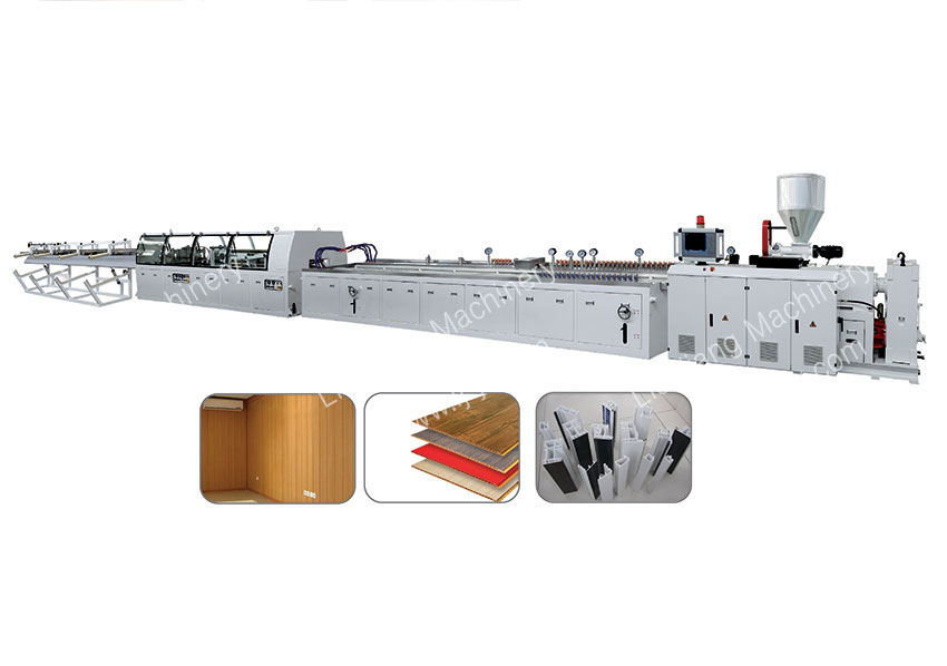 該生產線主要用于生產天花板,集成吊頂,外墻掛板,扣板腳線等。該設備由雙螺桿擠出機,真空定型臺,牽引機,全自動切割機,翻料平臺等構成。主機產量可根據客戶要求進行選配,該生產線工作平穩(wěn),可靠性好,得到了廣大客戶的一致好評。