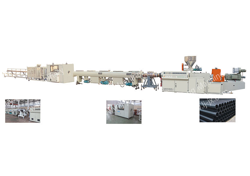 該生產(chǎn)線主要由單螺桿或錐形雙螺桿擠出機、真空定徑箱、噴淋冷卻水箱、牽引機、切割機、堆放架組成;配以不同規(guī)格模具,可生產(chǎn)壓力等級不同的給水、排污、化工防腐、電工穿線等各種規(guī)格PE、PVC管材。